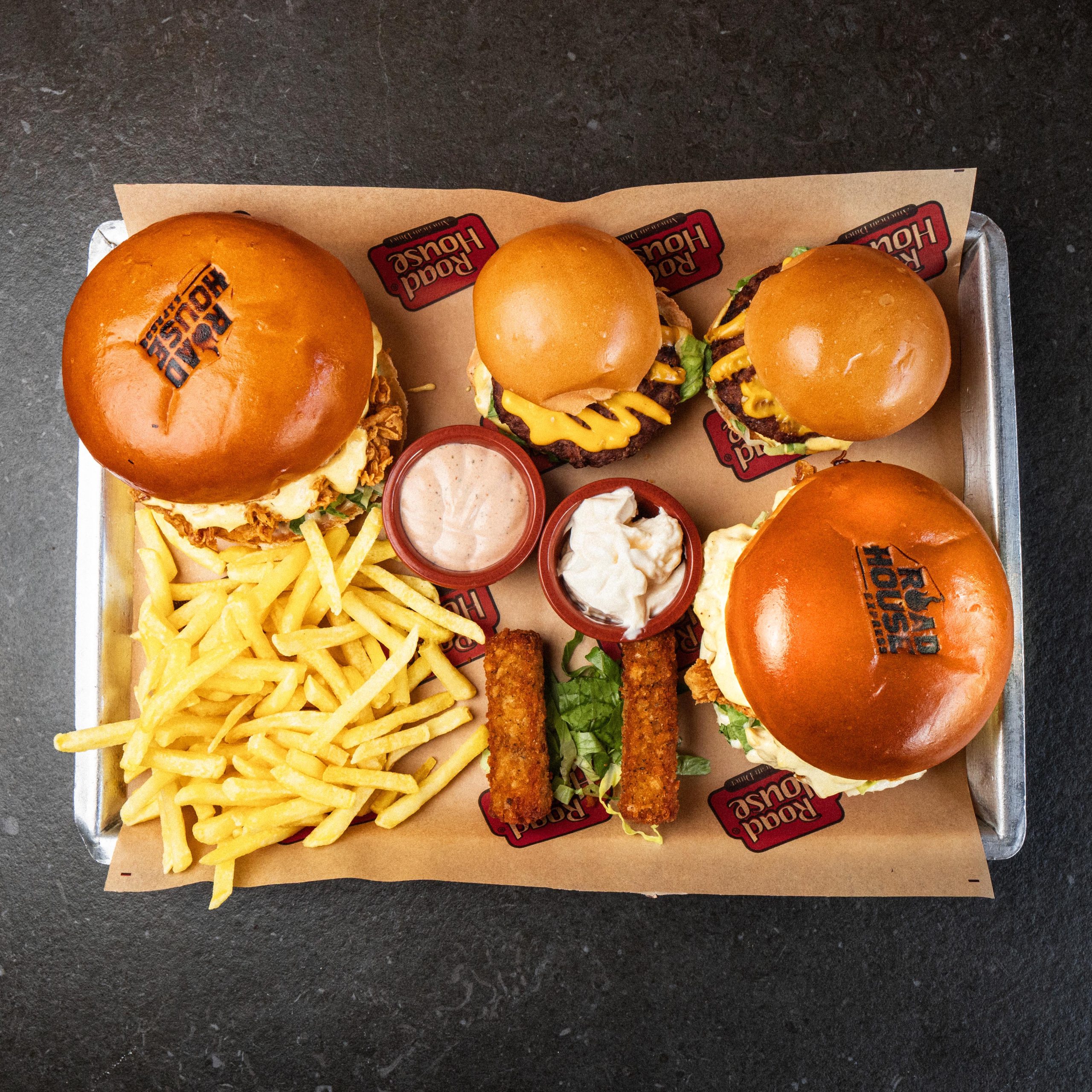 2 مايو دجاج سندويش – 2 سلايدر لحمة – 2 أصابع موزاريلا – كول سلو – بطاطا مقلية – صوص باربكيو – صوص رانش